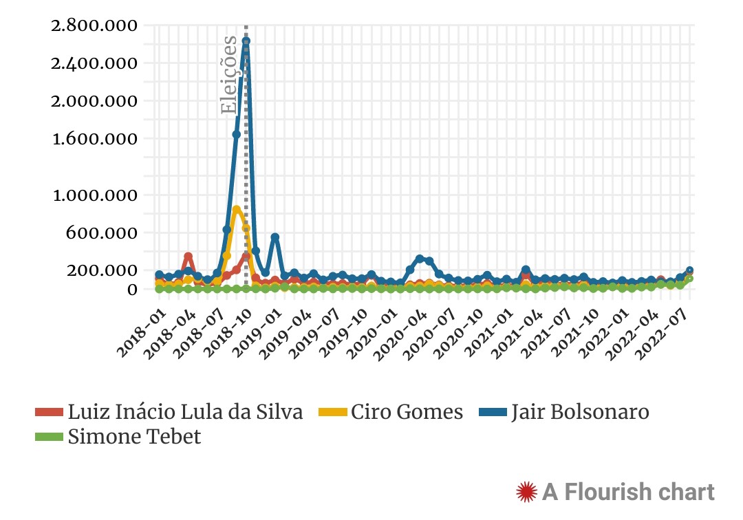 Bolsonaro teve cerca de 9 milhões de usuários impactados, seguido por Ciro (2 milhões) e Tebet (780 mil).