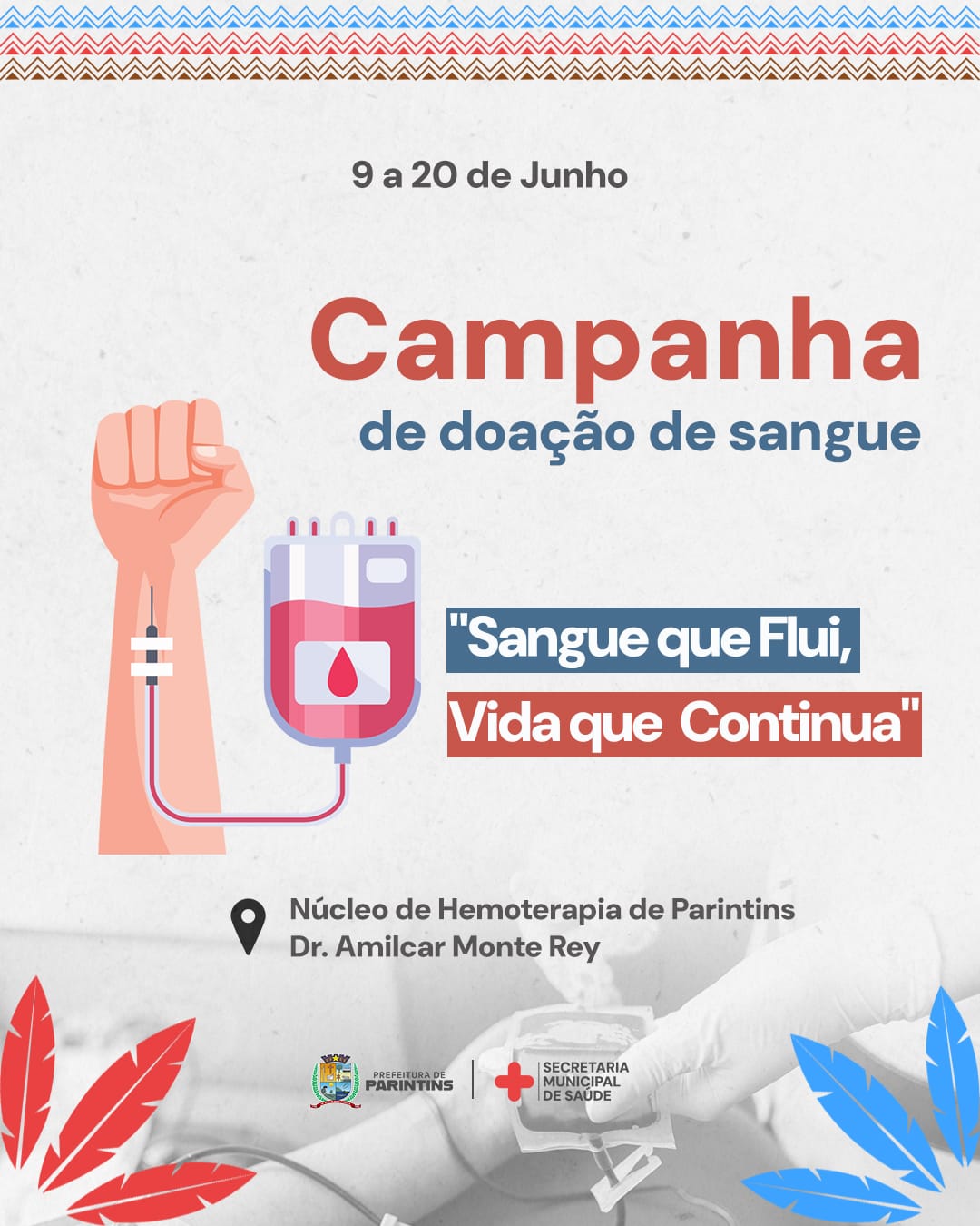 Com tema “Sangue, que flui e a vida continua”, o Banco de Sangue de Parintins inicia, no dia 9 de junho, a tradicional campanha de doação em alusão ao Festival Folclórico 2025, com o objetivo de garantir o abastecimento do estoque para o período de maior movimento no município. A ação é promovida pela Prefeitura de Parintins e tem como meta alcançar 100 bolsas.