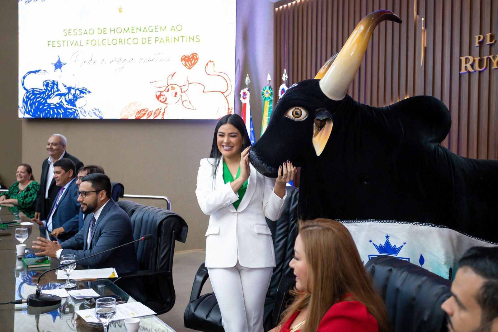 Os bois Caprichoso e Garantido evoluíram no plenário Ruy Araújo da Assembleia Legislativa do Estado do Amazonas (ALEAM), transformado simbolicamente na arena do bumbódromo para homenagear o Festival Folclórico de Parintins e os bumbás. A sessão foi presidida pela deputada estadual Mayra Dias (Avante), autora da propositura.