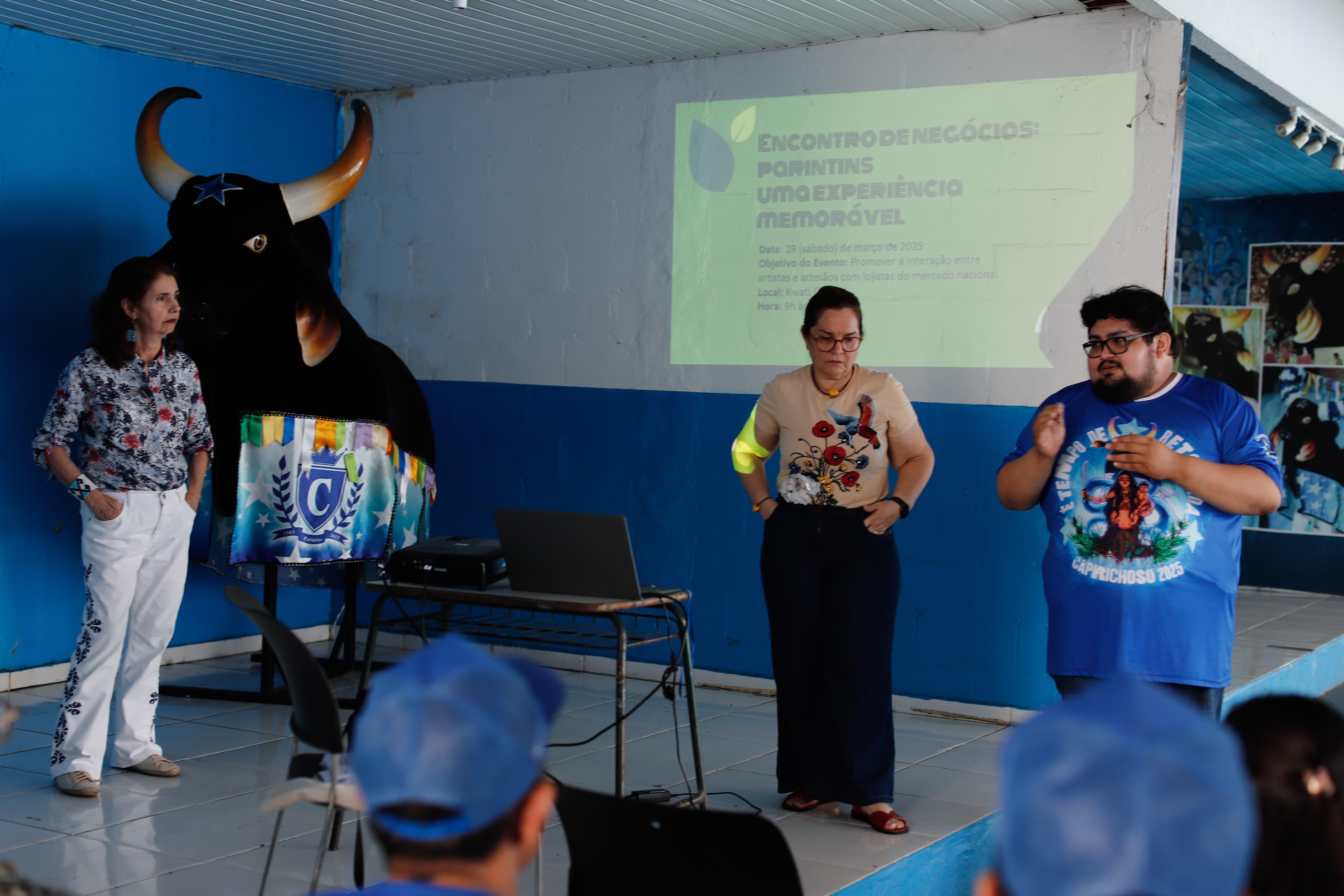 O Boi Caprichoso recebeu nesta quinta-feira (13) a visita das representantes do Serviço de Apoio às Micro e Pequenas Empresas (Sebrae), Lilian Silvia Simões e Rozana Trilha, para discutir um novo projeto voltado para o fortalecimento do artesanato local e a sustentabilidade do Festival de Parintins. A iniciativa conta com a parceria da Prefeitura de Parintins e tem como objetivo alinhar estratégias para aproveitar melhor os resíduos do festival e transformá-los em produtos comerciais.