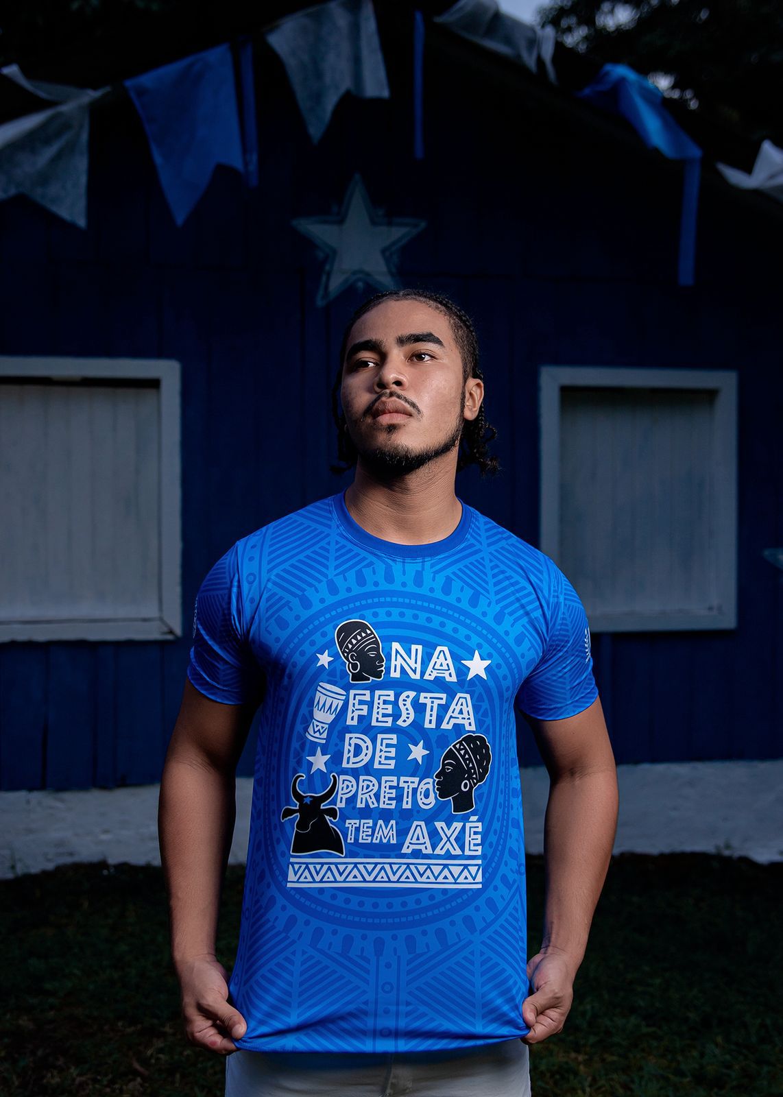 A camisa “Na festa de preto tem axé” foi registrada no Parananema, local marcado por encontros culturais e momentos históricos da nação azulada. Ali, o cenário celebra a ancestralidade, a música e a vibração espiritual que sempre acompanharam o Caprichoso.