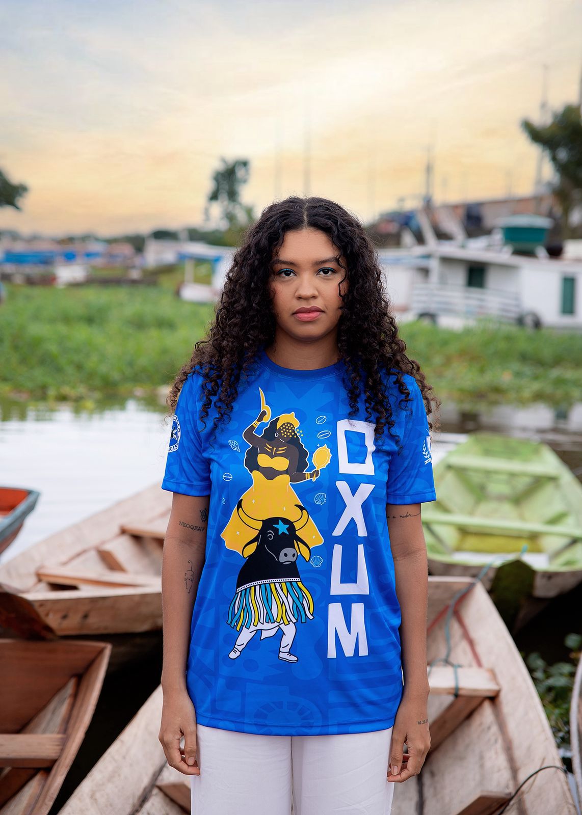 A coleção inicia com peças que evocam diferentes forças espirituais, cada uma conectada a um território da cidade. Oxum, orixá das águas doces, da beleza, do amor e da prosperidade, surge em registros feitos na Orla da União. O cenário de águas tranquilas dialoga com a essência da divindade que governa rios e fontes de vida.
