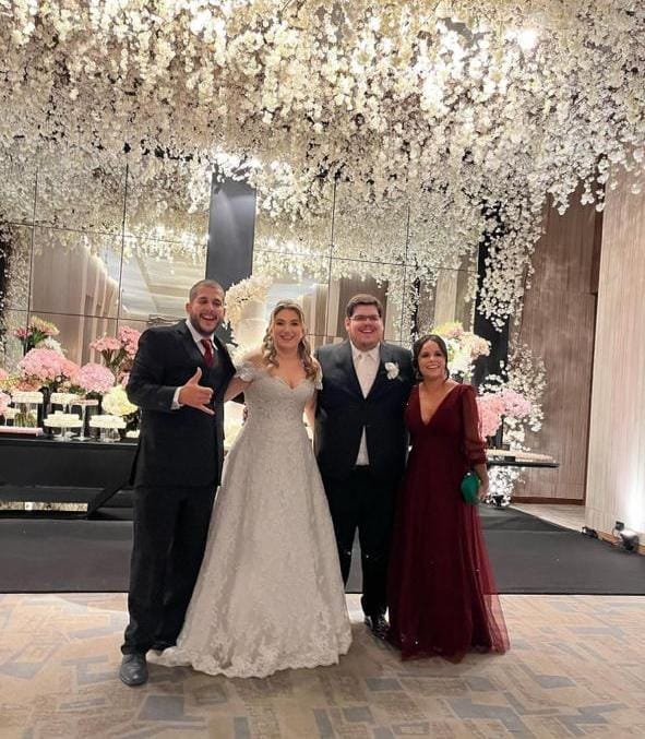 Para a ocasião, o streamer escolheu um clássico terno preto com uma camisa branca. Já a noiva optou por um vestido rendado confeccionado pela estilista Carol Hungria.
