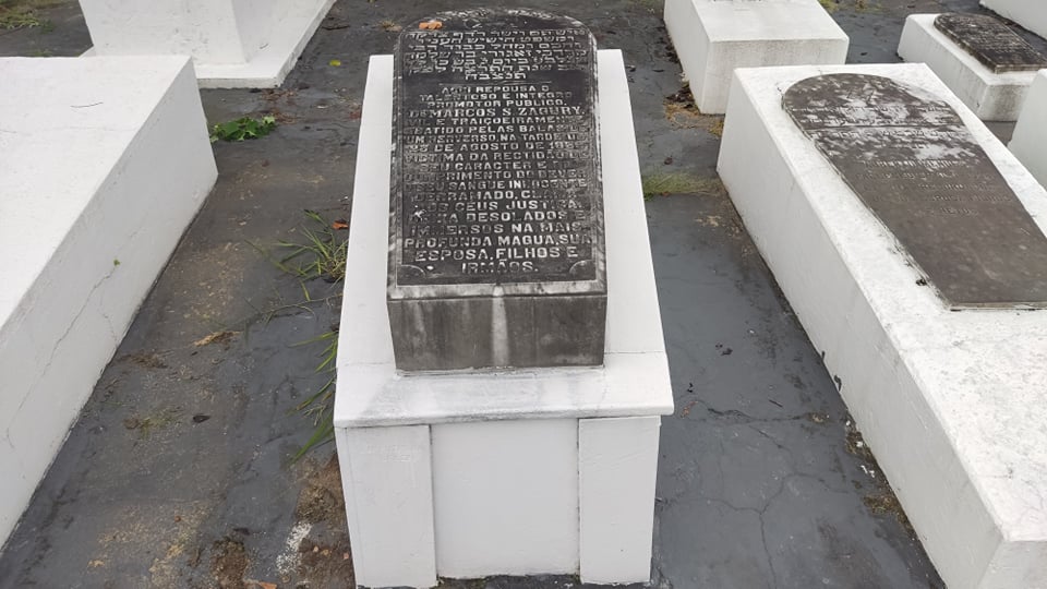 "Aqui repousa o talentoso e íntegro promotor público Marcos S. Zagury, vil e traiçoeiramente abatido pelas balas de um perverso, na tarde de 23 de Agosto de 1938 Victima da rectidão de seu carácter e do cumprimento do dever o seu sangue innocente derramado, clama aos Céus justiça”, está escrito na sepultura do promotor, que hoje concede nome ao Fórum de Justiça.