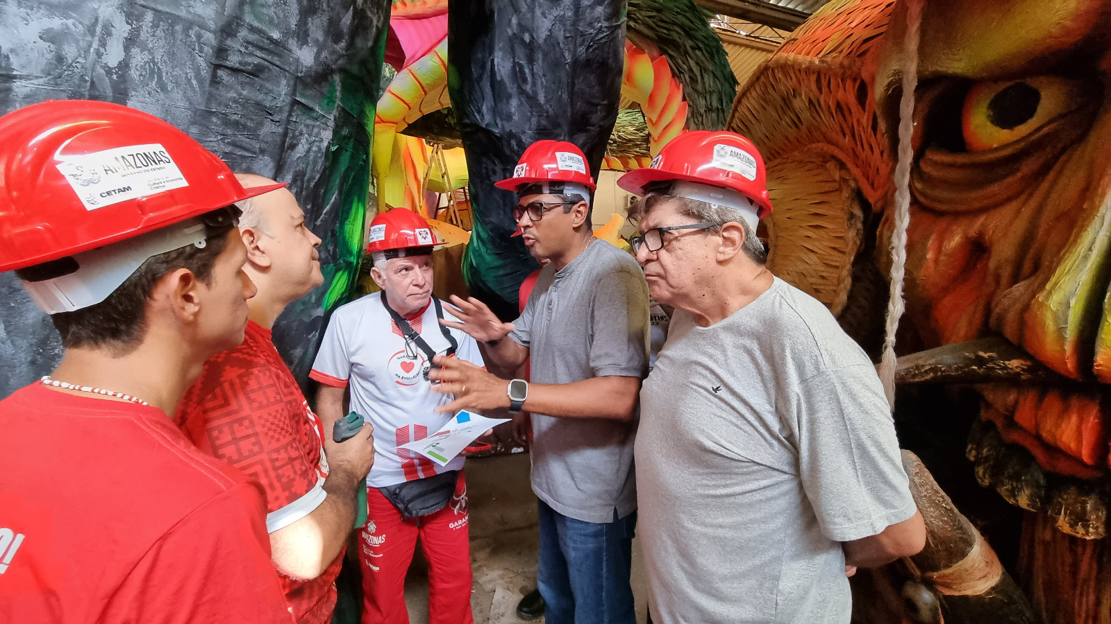 Uma comitiva da Secretaria de Cultura e Economia Criativa do Estado (SEC) visitou, na manhã deste domingo a Cidade Garantido e viu de perto o trabalho nos galpões e ateliês. O secretário Marcos Apolo e o diretor executivo da Maná Produções, André Guimarães, estavam no grupo que foi recebido pela diretoria do boi e a comissão de artes.