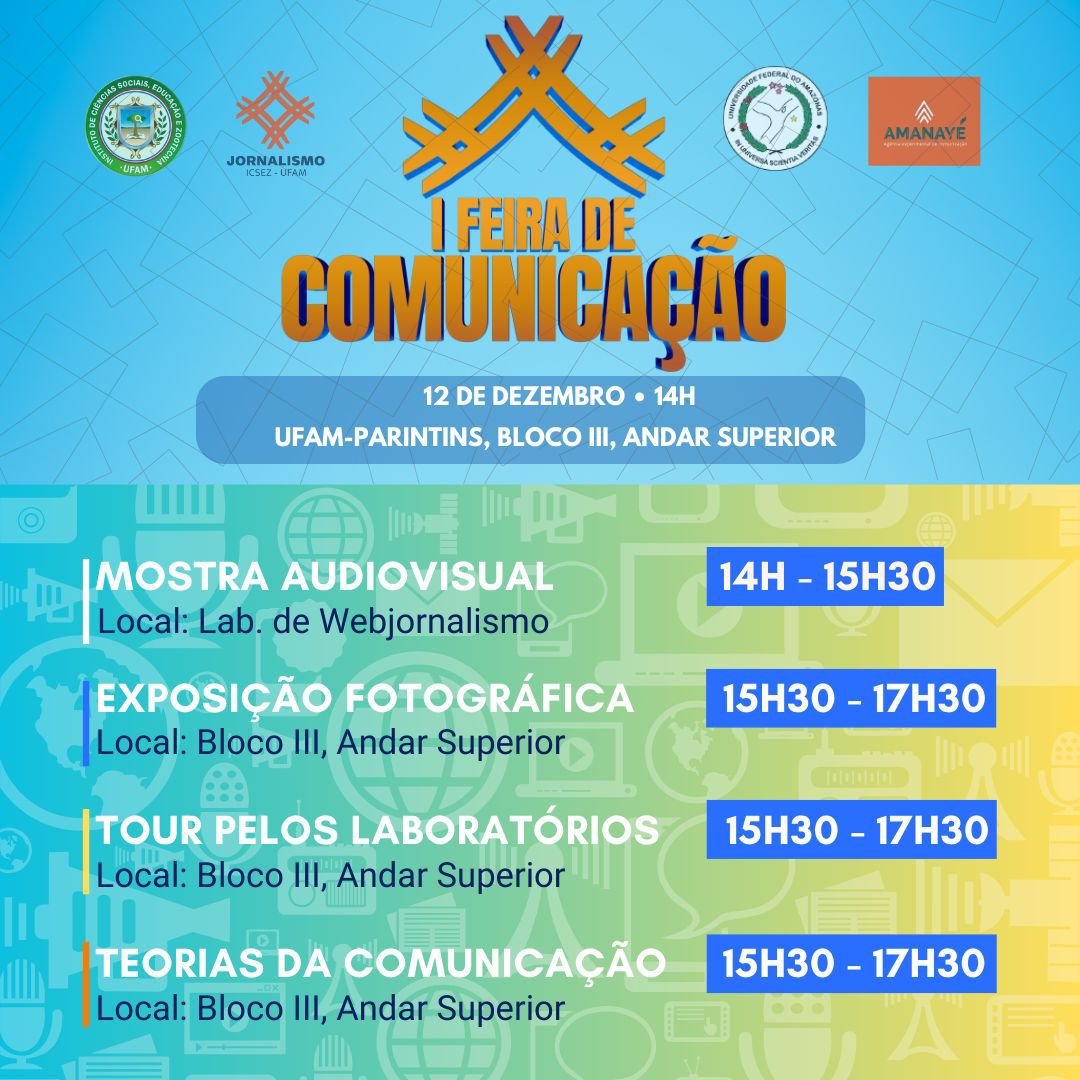 “A feira surge da necessidade de abordar as teorias da comunicação – um tema que, para muitos, pode parecer complicado – de maneira lúdica e envolvente. No nosso caso, voltamos o evento especialmente para os estudantes do 1º e 2º anos do Ifam. Além disso, queremos mostrar à comunidade o que está sendo produzido e ensinado aqui no curso, promovendo a prática das nossas atividades jornalísticas nos laboratórios. Será um evento muito especial. Venha participar com a gente!”, completou Sebastião Nascimento.