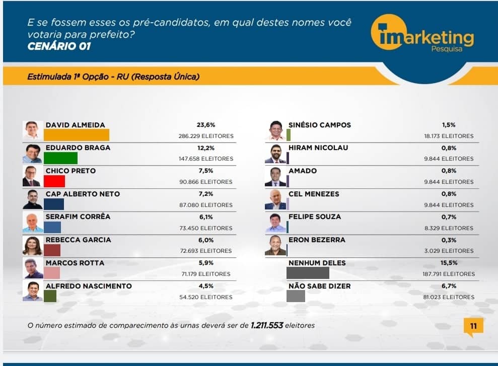 No 1º turno do próximo pleito, projeta-se que o eleitorado de Manaus apto a votar deverá ser de, aproximadamente, 1.368.986. Ao aplicarmos o percentual de abstenção média (11,5%) sobre esse total de eleitores (1.368.986), temos o possível número de ausentes no dia 4 de outubro: 157.433. Ou seja, em números estimados, o comparecimento às urnas deverá ser de 1.211.553 eleitores, o que significa dizer que cada 1% obtido por qualquer pré-candidato nesta pesquisa equivale a 12.116 votos.