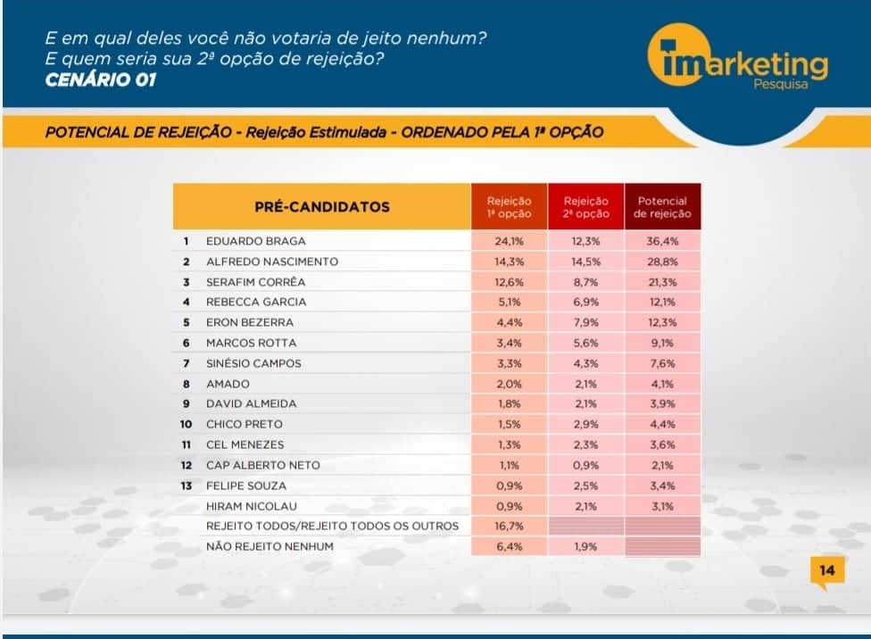 O ex-govenador Amazonino Mendes (SEM Partido) e o Senador Eduardo Braga (MDB) estão incluidos, uma vez em cada lista. Ambos são bem pontuados, mas também lideram o número de rejeição do eleitorado. Euardo é rejeitado por 36,4% e Amazonino tem a reijeição de 34,3%.