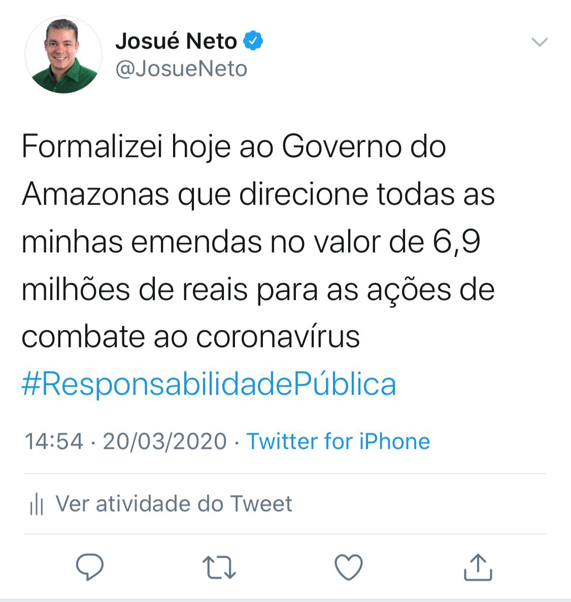 Através de ofício encaminhado ao Governado Wilson Lima e ao secretário Estadual de Saúde, Rodrigo Tobias, Josué sugere que os recursos sejam utilizados “para fins de prevenção à infecção e à propagação do COVID-19, no âmbito do Estado do Amazonas” e sugere que os recursos “sejam voltados para a aquisição de EPI´S (equipamentos de proteção individual) específicos para os profissionais de saúde que lidam diretamente com os pacientes acometidos pelo COVID-19; aquisição de equipamentos para UTI´S como respiradores mecânicos e demais equipamentos de suporte à vida; investimentos em equipamentos modernos, insumos e materiais para o mais rápido diagnóstico dos portadores do Coronavírus junto ao LACEN – AM”.