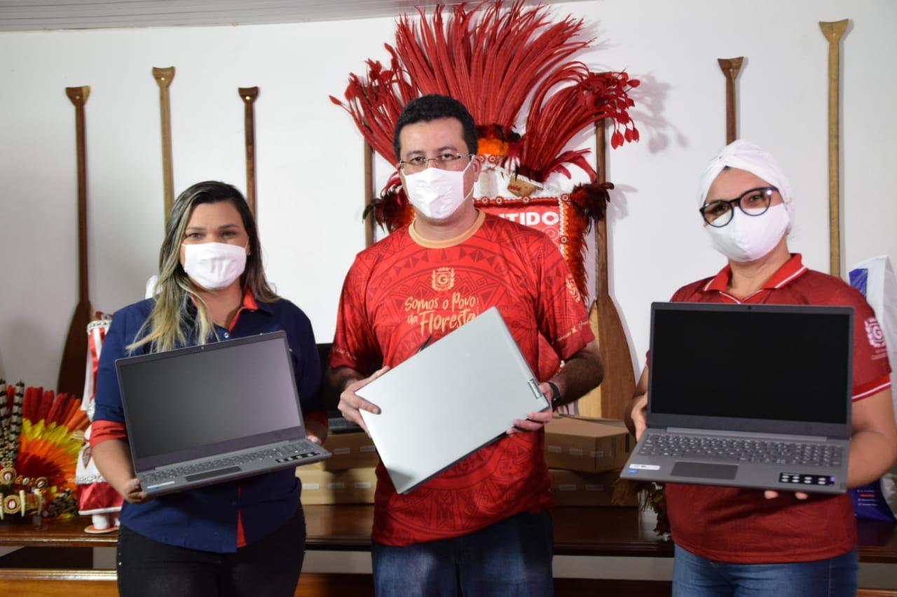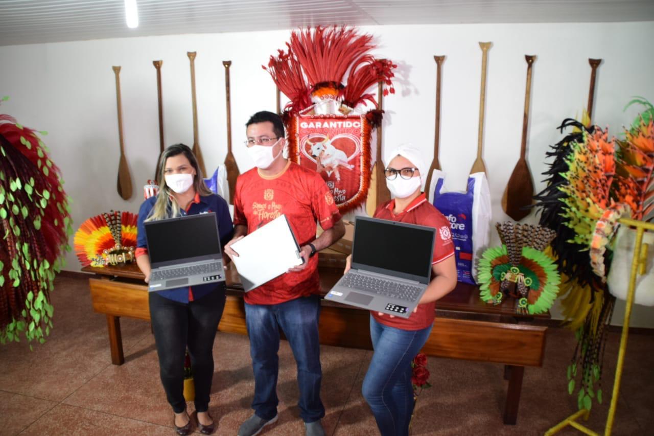 O Boi-Bumbá Garantido recebeu na tarde desta sexta-feira (31), 10 notebooks da empresa Info Store, em uma parceria que beneficiará os mais de 200 alunos da Universidade do Folclore “Paulinho Farias”. A entrega dos equipamentos aconteceu na Cidade Garantido ao presidente Fábio Cardoso e a reitora da projeto social, Irlany Ramos.