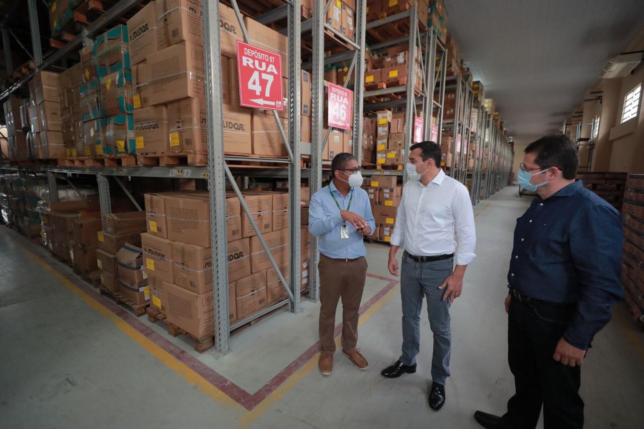 O governador Wilson Lima inspecionou, nesta segunda-feira (21/12), a Central de Medicamentos do Amazonas (Cema), que atinge 75% de abastecimento de medicamentos e insumos hospitalares em seus estoques. Em janeiro de 2019, quando ele assumiu o Governo do Estado, esse índice era de apenas 12%.