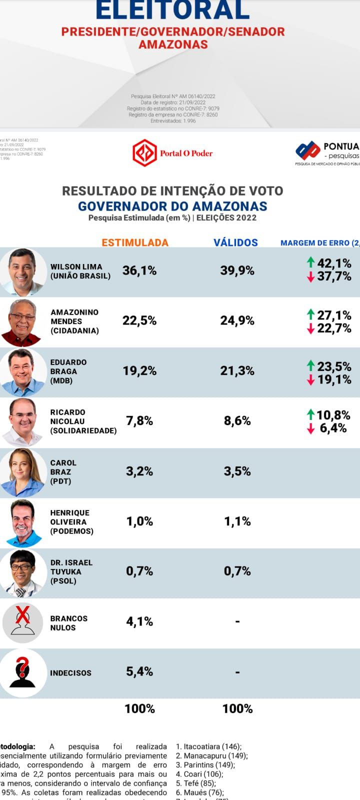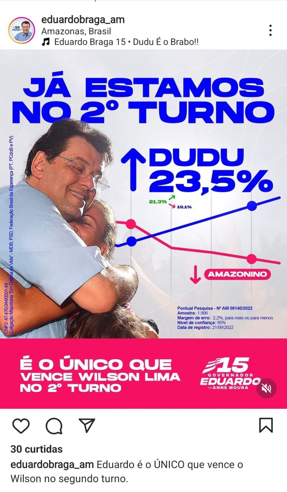 O candidato ao governo do Amazonas, Eduardo Braga (MDB), divulgou nesta sexta-feira, 30, fake news usando levantamento feito pelo Instituto Pontual Pesquisas, alegando que está no segundo turno das eleições, com 23,5% de intenções de voto, próximo de Wilson Lima (União Brasil), que lidera com 39,9% da preferência dos eleitores. No quadro alterado por Braga, ele está próximo ao candidato Amazonino Mendes (Cidadania), que aparece na pesquisa Pontual na segunda posição, com 24,9%.