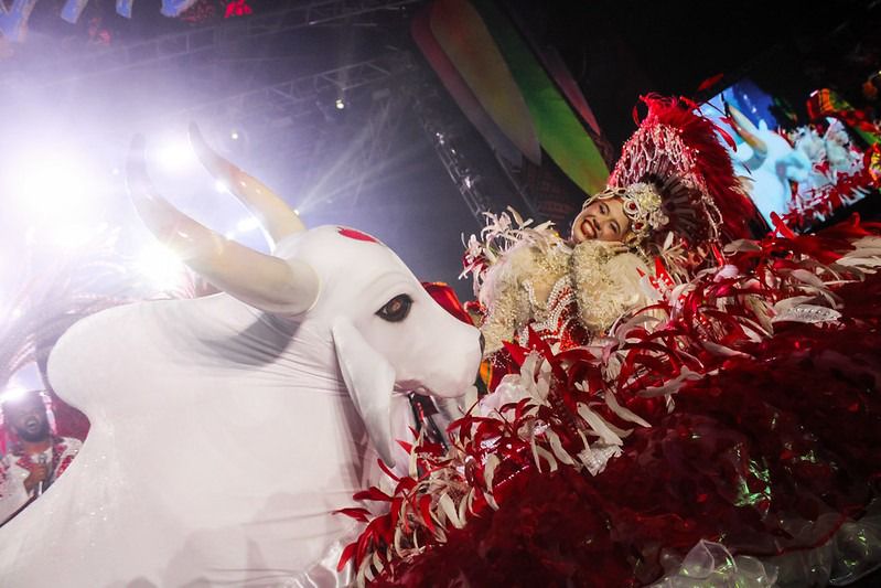 A arena foi tomada pelas cores azul e vermelha com as apresentações dos bois Caprichoso e Garantido, que transformaram o lançamento em um verdadeiro espetáculo, levando ao público uma prévia do que será apresentado no festival oficial.