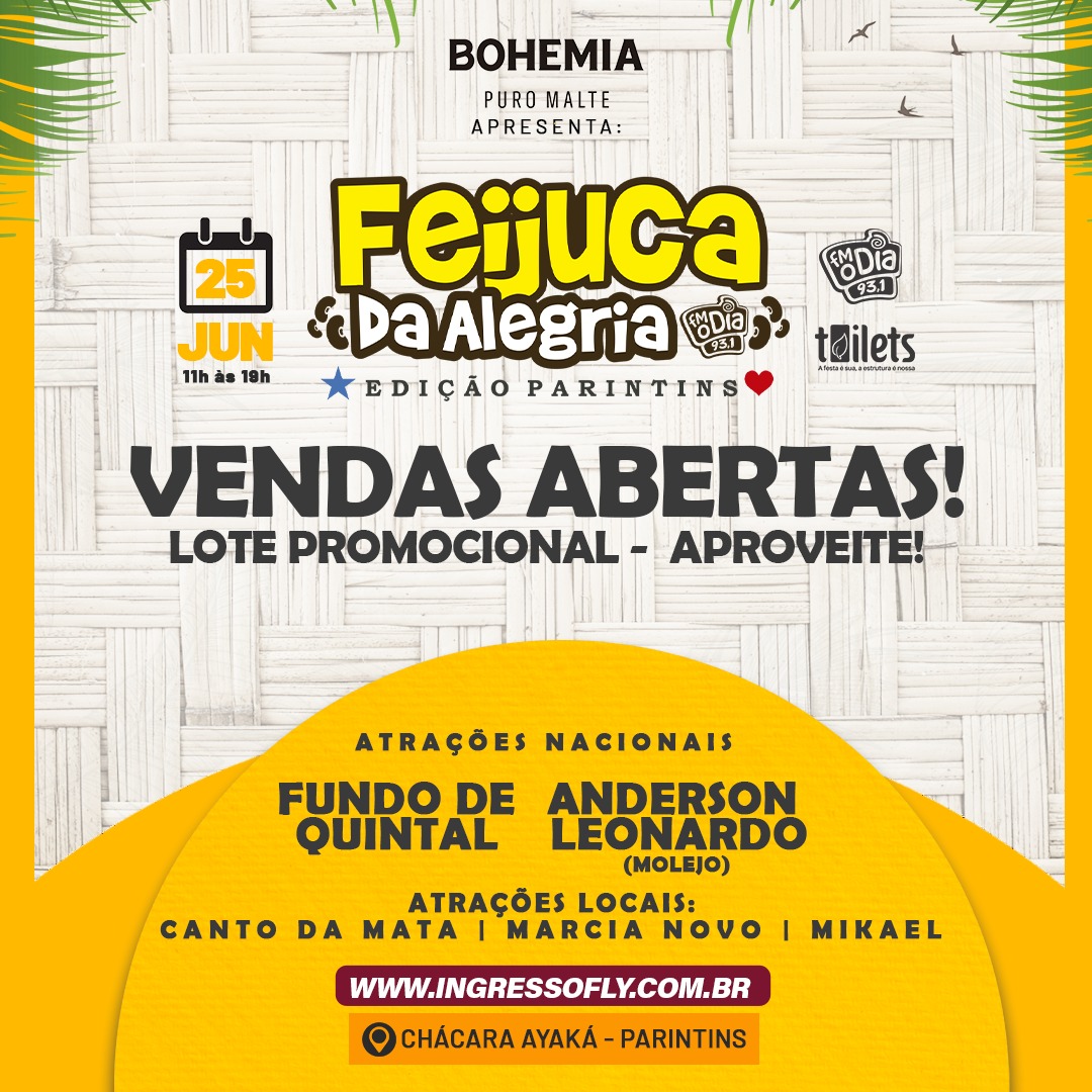 Os ingressos para a Feijuca da Alegria vão estar à venda a partir desta sexta-feira (15), no site www.ingressoflymcom. Os clientes que adquirirem neste primeiro lote vão contar com um valor promocional.