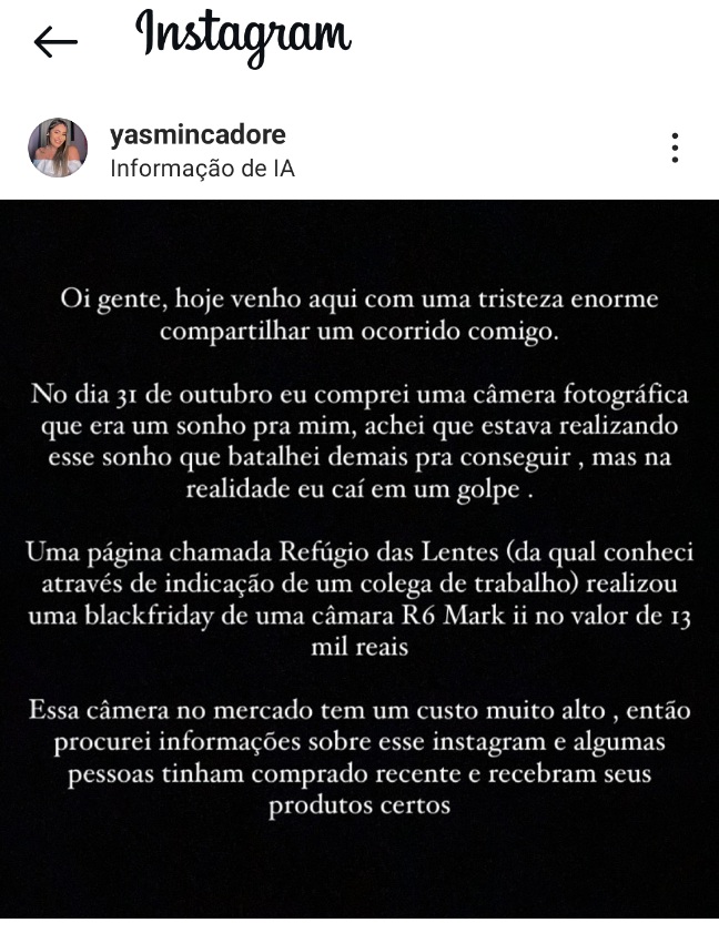 "Esse Instagram, Refúgio das Lentes, tinha credibilidade em Manaus. Pessoas já tinham comprado e recebido produtos. Ele entregava normalmente, e muita gente recomendava. Mas ele lançou uma Black Friday, e muitas pessoas compraram dele. Algumas compraram até oito meses atrás e não receberam, mas ninguém tinha tornado público o golpe", relatou Yasmin.