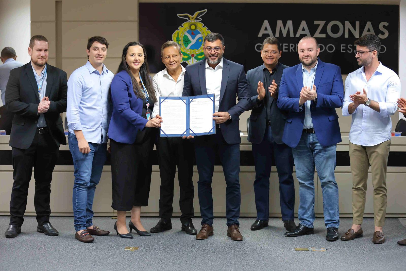 O governador Wilson Lima assinou, nesta quarta-feira (28/08), o contrato com a Caixa Econômica Federal para construção do primeiro residencial do programa Amazonas Meu Lar, em parceria com o Minha Casa, Minha Vida, no bairro Novo Aleixo, zona norte de Manaus. Os recursos são da ordem de R$ 10 milhões, parte deles com contrapartida estadual para a construção de 48 unidades habitacionais na área.
