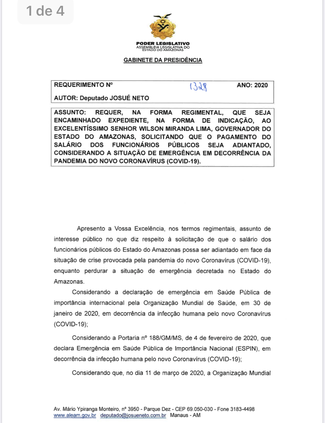 Josué solicitou no último dia 23 de março deste ano, no início do coronavírus (Covid-19) no Amazonas, que o Poder Executivo fizesse a antecipação do pagamento dos servidores do Estado devido a pandemia. O pedido foi feito através do Requerimento nº 1328/2020 enviado ao Governador Wilson Lima.