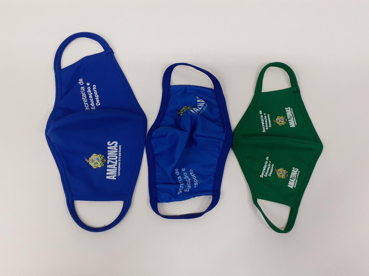 Os modelos azuis são para servidores da educação e estudantes de Ensino Médio, com tamanhos M e G. As máscaras de modelo verde, de tamanho P, serão distribuídas aos alunos do Ensino Fundamental, que somente retornam às atividades no próximo dia 24 de agosto.