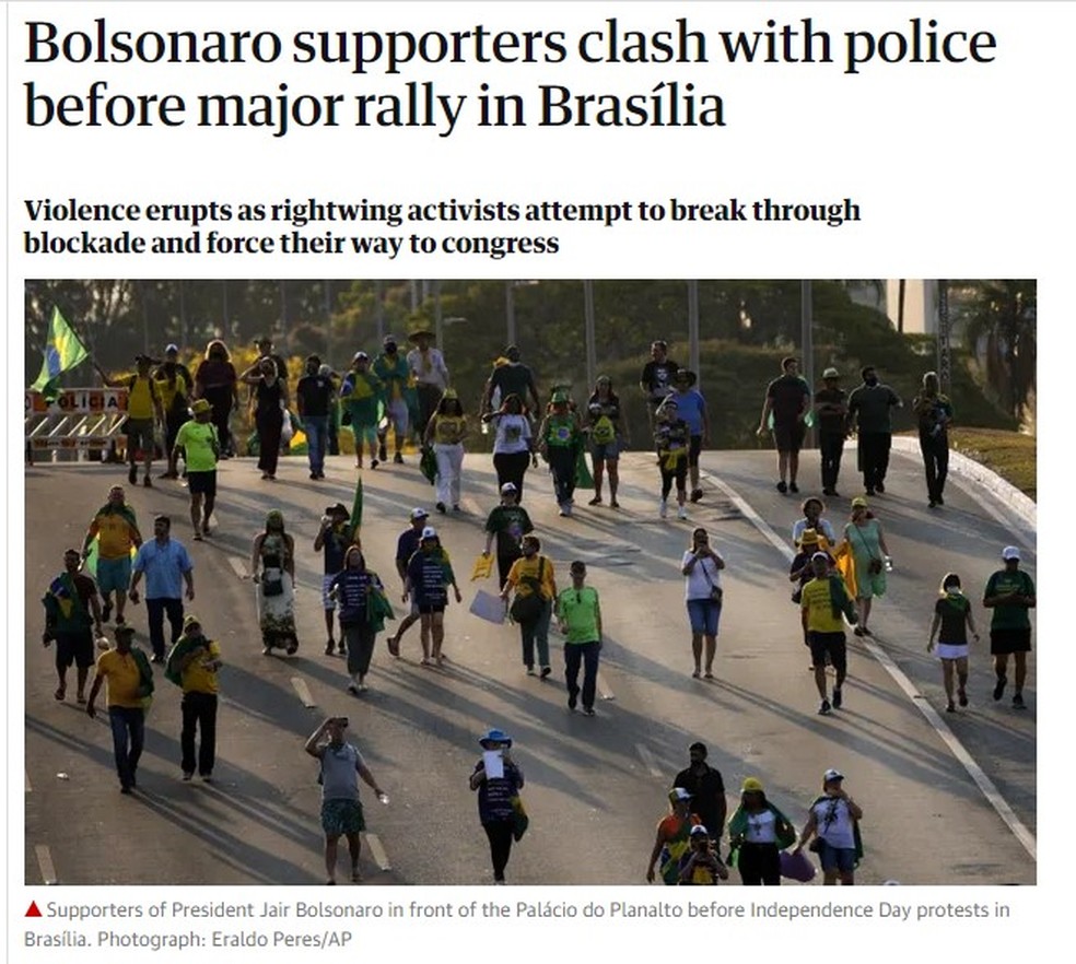 Reprodução do 'The Guardian', que publicou um texto sobre as manifestações do dia 7 de setembro — Foto: Reprodução/The Guardian