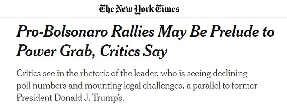 O “New York Times” publicou uma reportagem com o título “Protestos a favor de Bolsonaro podem ser um prelúdio a um golpe, dizem críticos”.