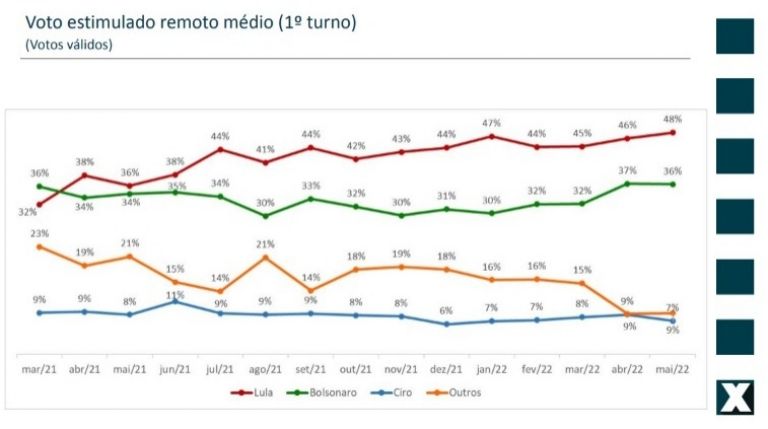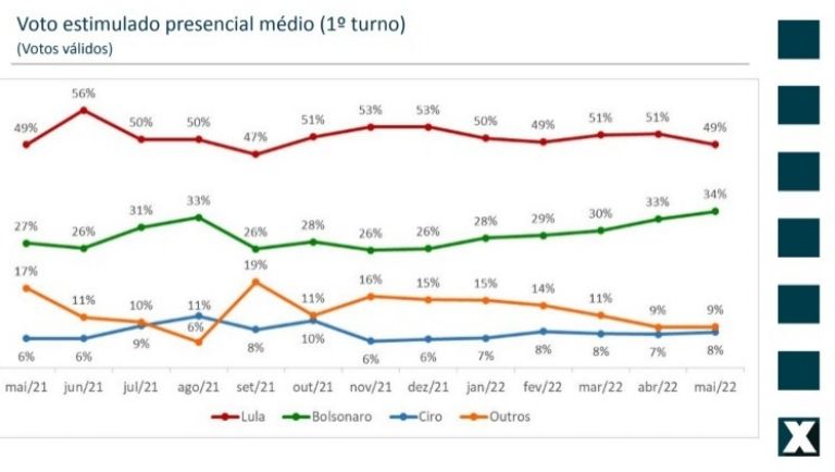 Contando-se apenas os votos válidos na media das pesquisas presenciais - incluindo a Quaest/Genial divulgada nesta semana - Lula oscilou dois pontos para menos entre abril e maio, mantendo-se em 49%. O percentual está dentro do histórico do petista, que desde maio de 2021 variou entre 47% e 56% dos votos válidos.