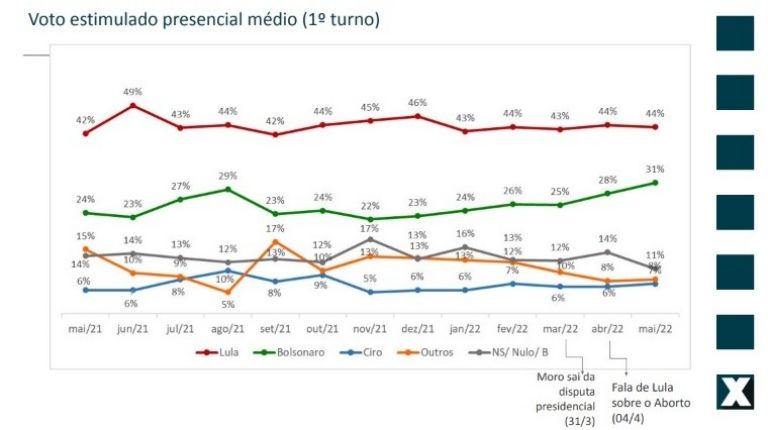 Ainda em relação às pesquisas presenciais, nos votos totais, Lula mantém a liderança com 44%, seguido de Jair Bolsonaro com 31%. Ciro tem 7%, mesmo percentual de todos os outros candidatos da terceira via somados. Brancos e nulos eram 14% e são 11%.