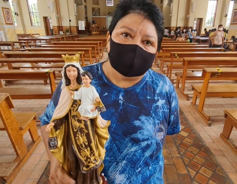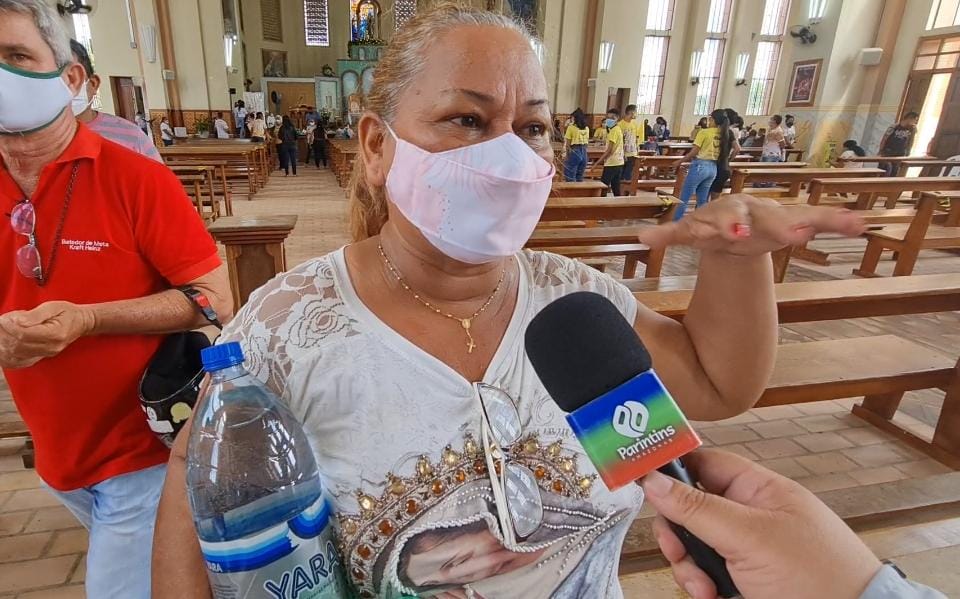 Dona Justina Teixeira, 56 anos, pegou o Coronavírus no começo do ano. Disse à reportagem que desde mês de abril, mesmo com dificuldades, chega até a Catedral de Parintins para agradecer, o que chamou de Milagre de Nossa Senhora. "Nossa Senhora é Poderosa e Milagrosa. Estou aqui para agradecer a vida. Com muita dificuldade chego a Igreja, mas sempre estou na missa do meio dia. Tive coronavírus e em consequência fiquei com muitos problemas de fraqueza. Fiz um pedido de intercessão a Nossa Senhora e ela me ajudou a conseguir superar. Digo que a pessoa creia mesmo em Deus, pois Nossa Senhora do Carmo é Poderosa e Milagrosa mesmo”, diz Justina, que conseguiu que o Padre abençoasse dois litros de água benta.