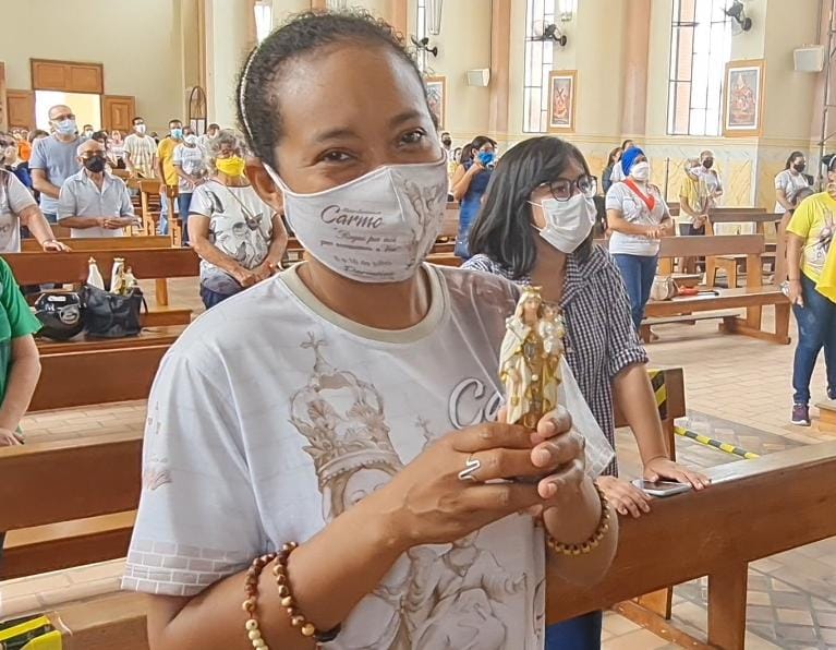 Segurando uma pequena imagem de Nossa Senhora do Carmo, a jovem Geise Printes afirma que incluiu de forma prioritária a palavra “gratidão" depois de vencer o Coronavírus. Ela conta que veio até a Catedral agradecer a Virgem do Carmo, pois sabe que fez o pedido da cura e foi atendida. O devastador vírus invadiu a família de Geise, além dela, outros familiares foram infectados. Segundo Geise, um tio acabou morrendo em decorrência do Coronavírus, e hoje a pequena imagem da Santa é uma espécie de amuleto da sorte.