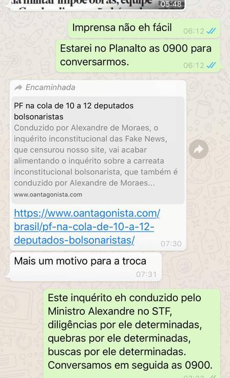 Ao “Jornal Nacional”, da TV Globo, Moro enviou a troca de mensagens com o presidente. Na imagem, Bolsonaro compartilha um link do site “O Antagonista”. O texto da publicação cita uma informação apresentada pelo colunista Merval Pereira, do GLOBO, de que o primeiro inquérito “já tem uma relação de 10 a 12 deputados bolsonaristas, mais empresários, que tiveram o sigilo quebrado, e a Polícia Federal estava a ponto de fazer busca e apreensão em seus endereços quando veio a quarentena”. Acompanhado do link, Bolsonaro diz que este seria “mais um motivo para a troca”.
