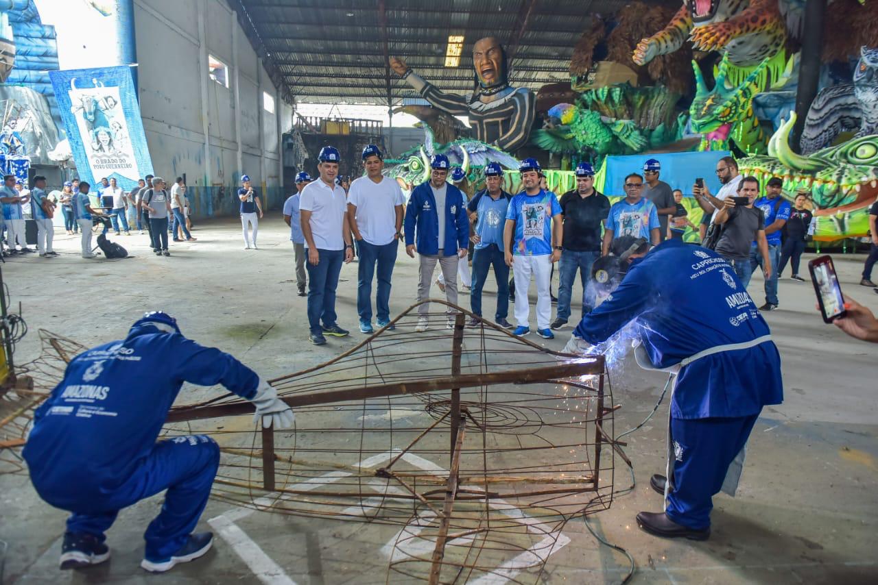“É muito importante isso, porque, geralmente, antes não tinha isso tudo. Agora, hoje em dia, o governador traz tudo isso pra gente”, afirmou Jander Bentes, soldador do boi Caprichoso, que recebeu o cumprimento do governador Wilson Lima, enquanto soldava uma estrutura de ferro no galpão do boi Azul.