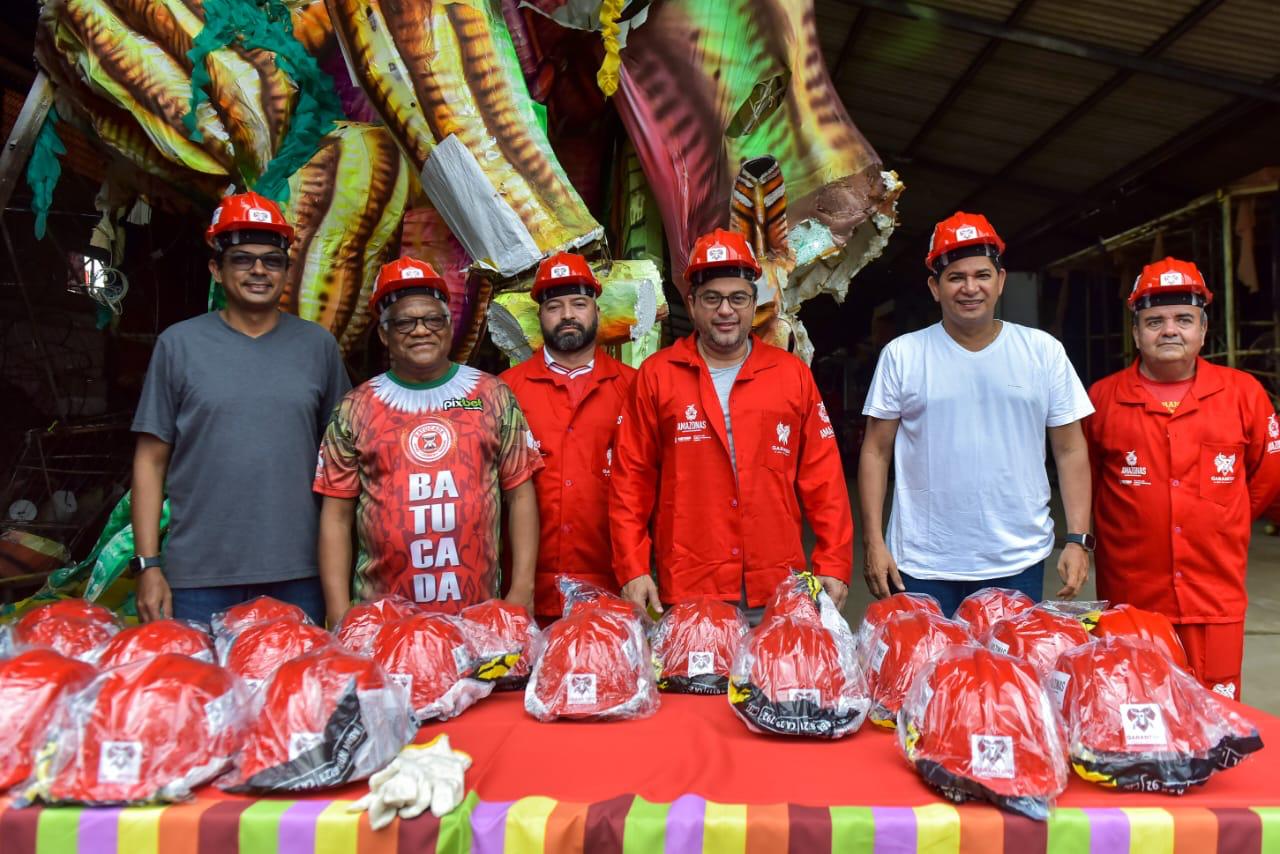 Ao todo, Wilson Lima fez a entrega de 1,2 mil kits de EPIs, que incluem botas, calças, camisas e capacetes personalizados com as cores de cada boi bumbá, com a marca oficial do festival 2023 - feita pelos jovens artistas parintinenses Kemerson Freitas e Alziney Pereira, os ‘Curumiz’.