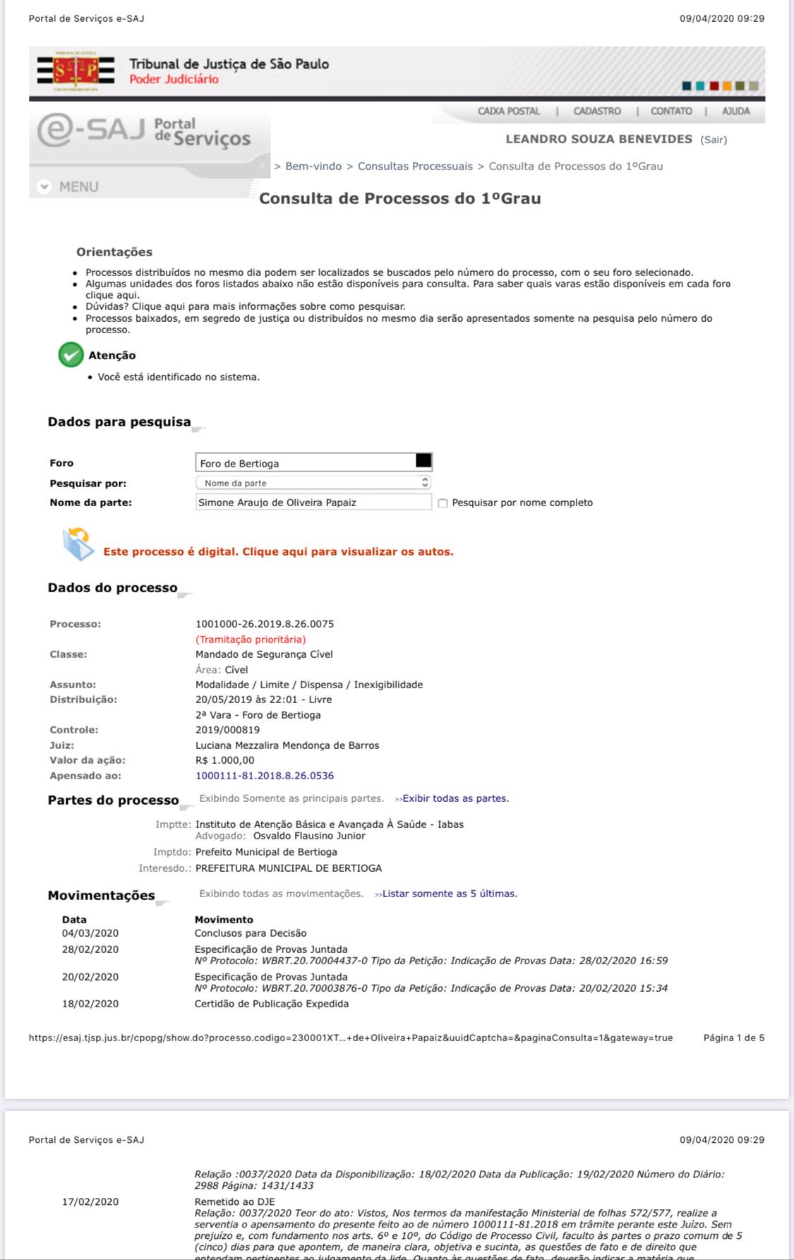 O primeiro processo (1001000-26.2019.8.26.0075) refere-se a um pedido para suspensão de um chamamento público firmado pela Prefeitura Municipal de Bertioga, tendo como co-ré a atual secretária, Simone Papaiz. O caso está em tramitação regular e refere-se ao descontentamento de um participante que não foi qualificado como gostaria para atuar como organização social num hospital municipal de Bertioga. O pedido de liminar do autor foi negado; o Ministério Público opinou pelo indeferimento da liminar de igual forma por não considerar qualquer indício de ilegalidade nos atos praticados no processo administrativo de escolha da entidade. O caso segue seu curso e ainda não tem decisão final que aplique qualquer sanção aos réus ou julgue favoravelmente a eles, ou seja, não há qualquer comprovação de ato ilegal por parte da seretária no curso do processo.