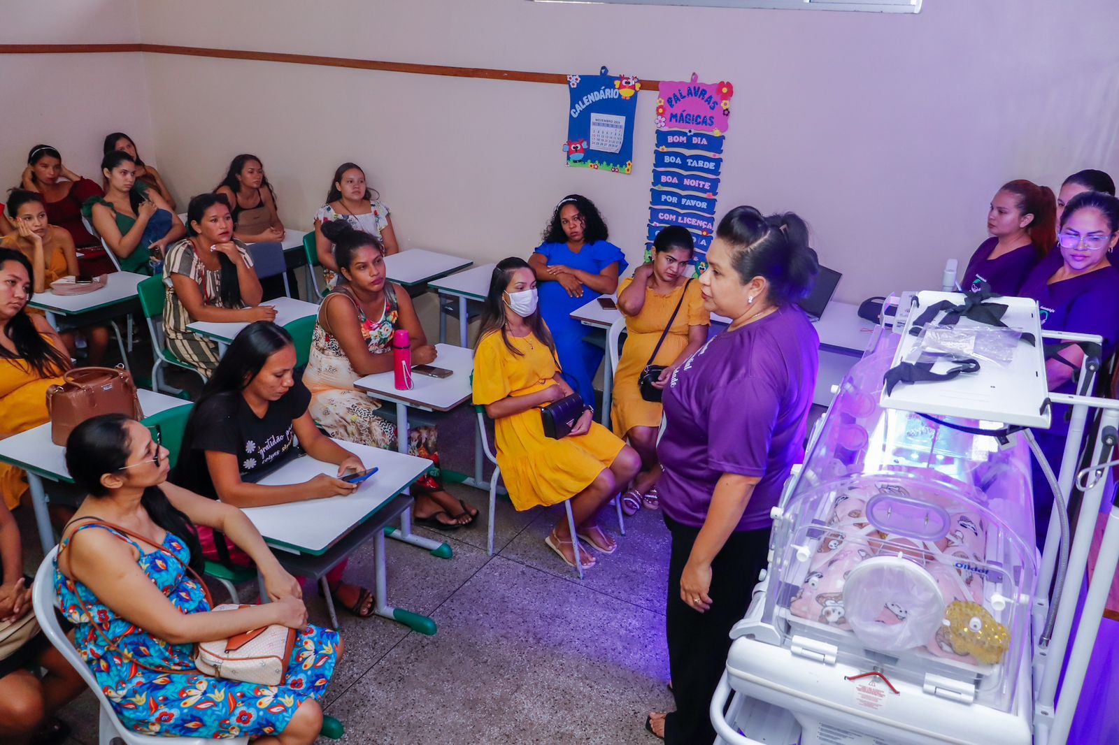 Nesta edição, o projeto reuniu mais de cem mães na Escola Municipal Beatriz Maranhão, onde os participantes receberam orientações sobre primeiros socorros, cuidados com recém-nascidos, amamentação e cuidados específicos para bebês prematuros ou de baixo peso. A ação integra a programação do Novembro Roxo, mês dedicado à conscientização sobre a prematuridade e à sensibilização para os cuidados especiais que esses recém-nascidos nascem.
