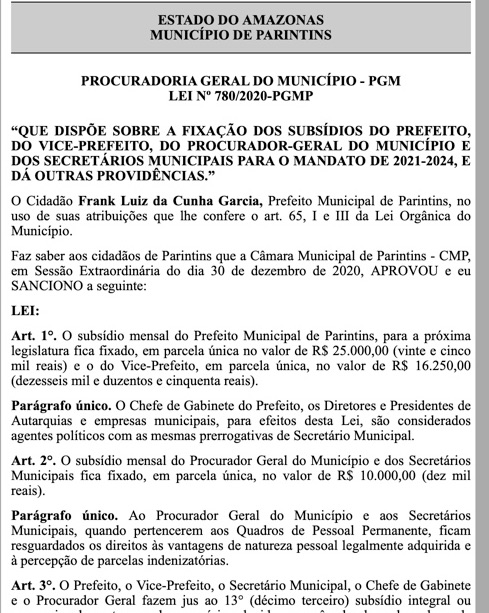 A partir desse mês de janeiro de 2021 o salário mensal do Prefeito Municipal de Parintins fica fixado, em parcela única no valor de R$ 25.000,00 (vinte e cinco mil reais) e o do Vice-Prefeito, em parcela única, no valor de R$ 16.250,00 (dezesseis mil e duzentos e cinquenta reais).