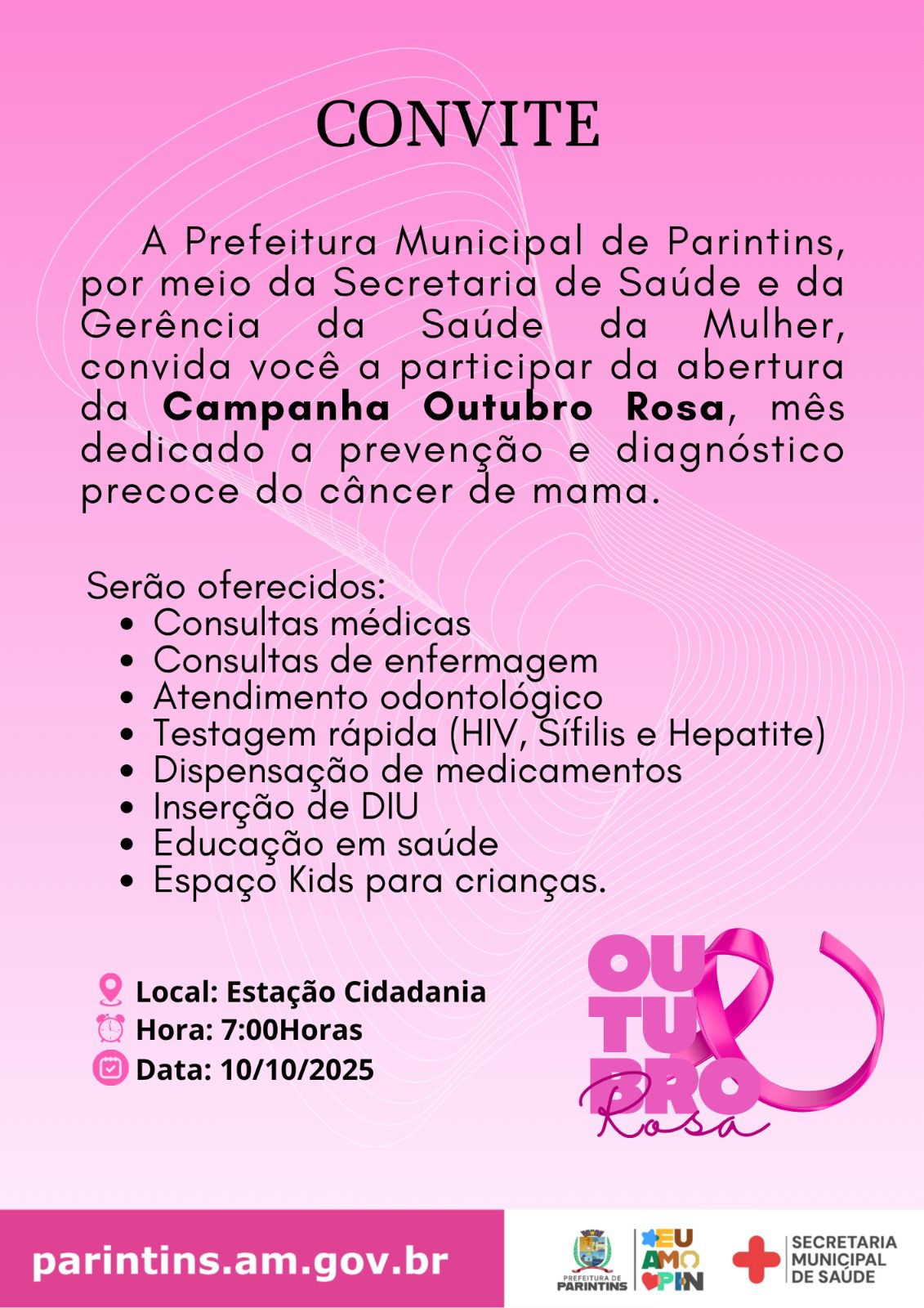 O cuidado com a saúde é feito o ano todo. Para isso, a Prefeitura de Parintins, com atuação da Secretaria Municipal de Saúde (SEMSA), realiza nesta sexta-feira, 10, a abertura oficial da Campanha Outubro Rosa, mês dedicado à prevenção e à detecção precoce do câncer de mama e do câncer do colo do útero. O evento acontecerá a partir das 7h, na Estação Cidadania, bairro da União, com uma programação especial voltada à saúde e ao bem-estar das mulheres parintinenses.