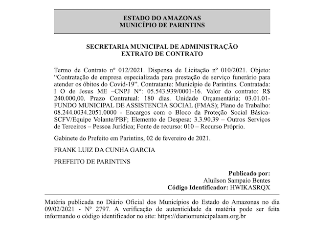 A cidade de Parintins que ultrapassou, infelizmente nesse mês de fevereiro o número de 220 pessoas mortas em decorrência de infecções da COVID-19, finalizou através da Secretaria Municipal de Administração o termo de contrato nº 012/2021 e com dispensa de Licitação nº 010/2021 a "Contratação de empresa especializada para prestação de serviço funerário para atender os óbitos do Covid-19”.