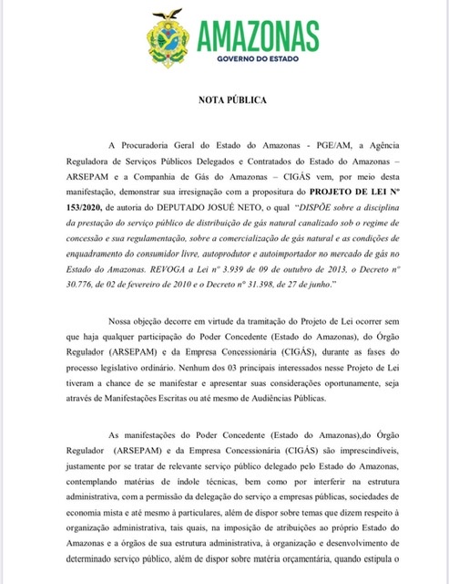 A Procuradoria Geral do Estado (PGE), Agência Reguladora de Serviços Públicos Delegados e Contratados do Estado do Amazonas (Arsepam) e a Companhia de Gás do Amazonas (Cigás), divulgaram nota pública conjunta, nesta quarta-feira (08/04), com objeções ao Projeto de Lei nº 153/2020, de autoria do deputado estadual Josué Neto, que dispõe sobre a distribuição e comercialização de gás natural canalizado no estado.