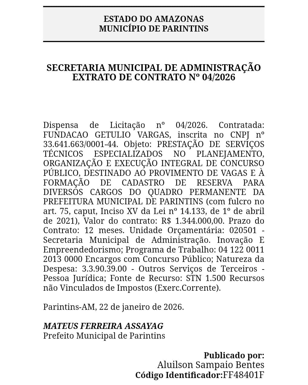 A Prefeitura de Parintins oficializou a contratação da Fundação Getúlio Vargas (FGV) para planejar, organizar e executar o concurso público municipal, encerrando um período de mais de 15 anos sem a realização de certames para o quadro efetivo do município. O contrato, firmado pelo prefeito Mateus Assayag (PSD), tem valor global de R$ 1.344.000,00 e foi publicado no Diário Oficial do Município no dia 22 de janeiro de 2026.