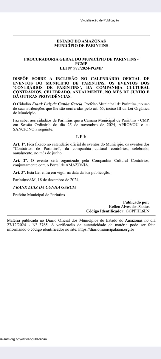 PARINTINS,AM – O prefeito de Parintins, Frank Bi Garcia, sancionou a Lei nº 58/2024 que inclui o show ‘Contrários’ no calendário oficial de eventos do município de Parintins.