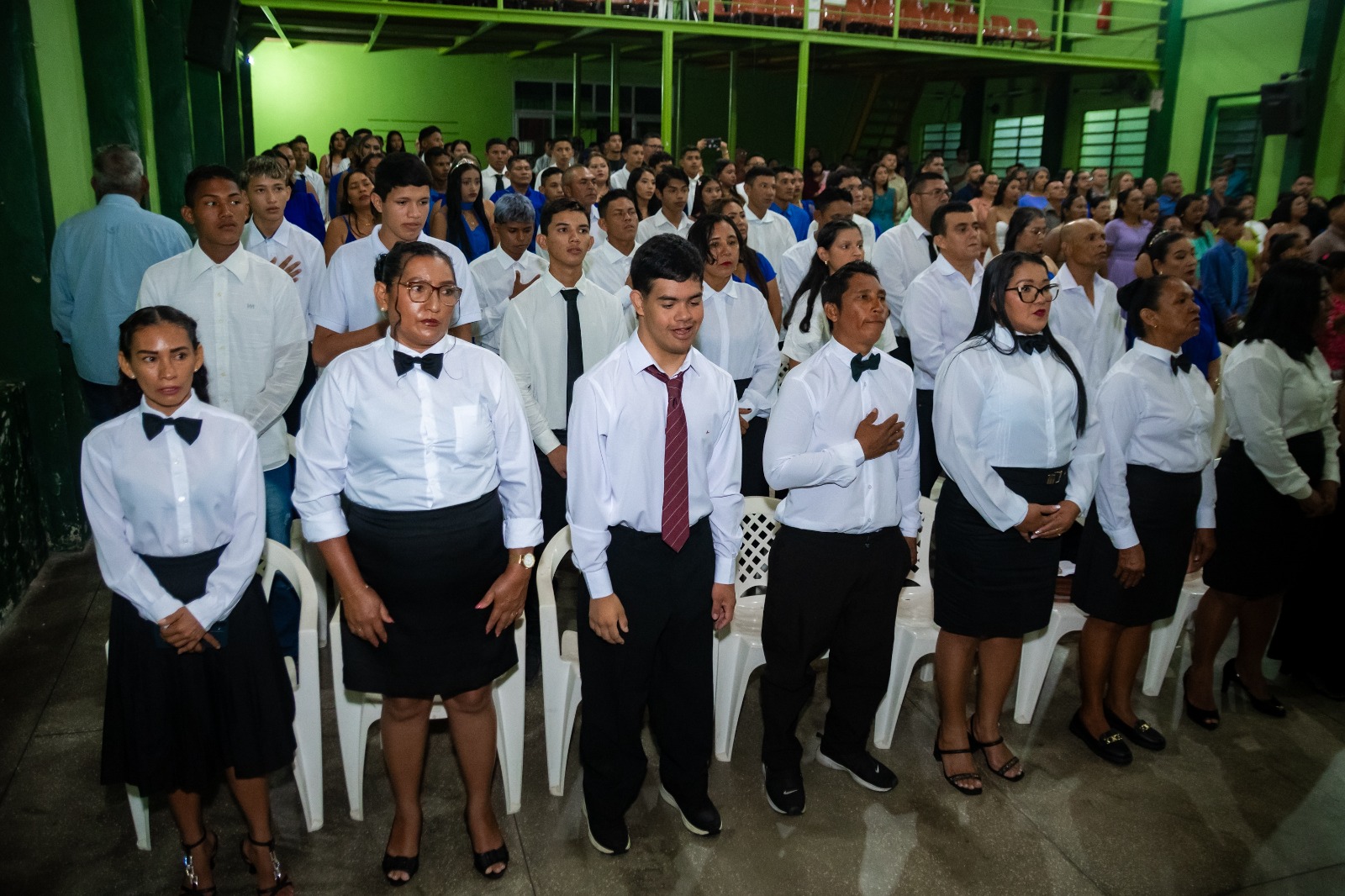 Um total de 122 estudantes da Educação de Jovens e Adultos (EJA) participou da formatura do Ensino Fundamental promovida pela Prefeitura de Parintins, por meio da Secretaria Municipal de Educação (Semed). A solenidade ocorreu na noite desta quinta-feira (18) no auditório Dom Arcângelo Cerqua, reunindo concludentes das escolas municipais Beatriz Maranhão, Luz do Saber, Minervina Reis e Escola da Paz de Parintins.