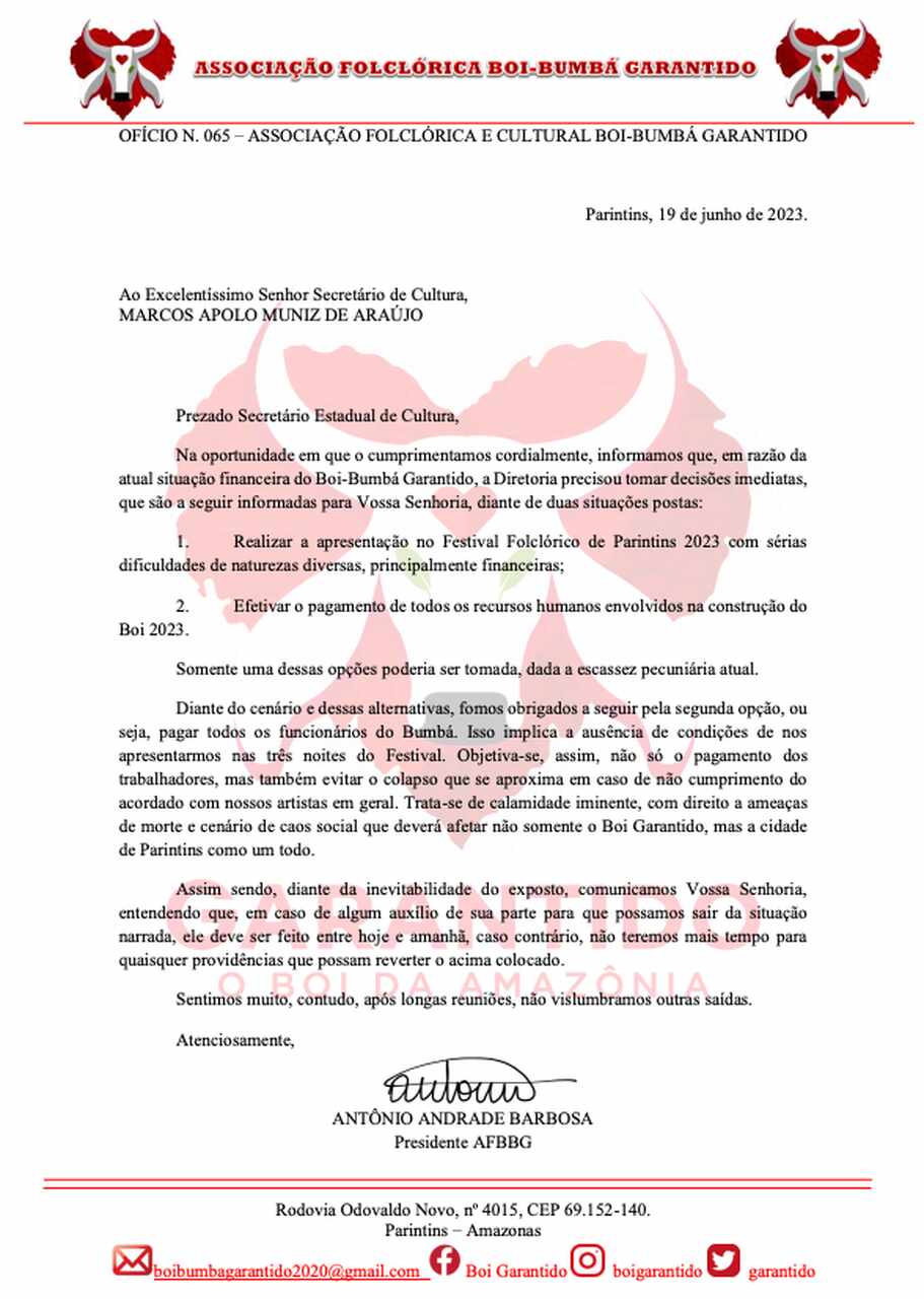 “Diante do cenário e dessas alternativas, fomos obrigados a seguir pela segunda opção, ou seja, pagar todos os funcionários do Bumbá. Isso implica a ausência de condições de nos apresentarmos nas três noites do Festival. Objetiva-se, assim, não só o pagamento dos trabalhadores, mas também evitar o colapso que se aproxima em caso de não cumprimento do acordado com nossos artistas em geral. Trata-se de calamidade iminente, com direito a ameaças de morte e cenário de caos social que deverá afetar não somente o Boi Garantido, mas a cidade de Parintins como um todo”.