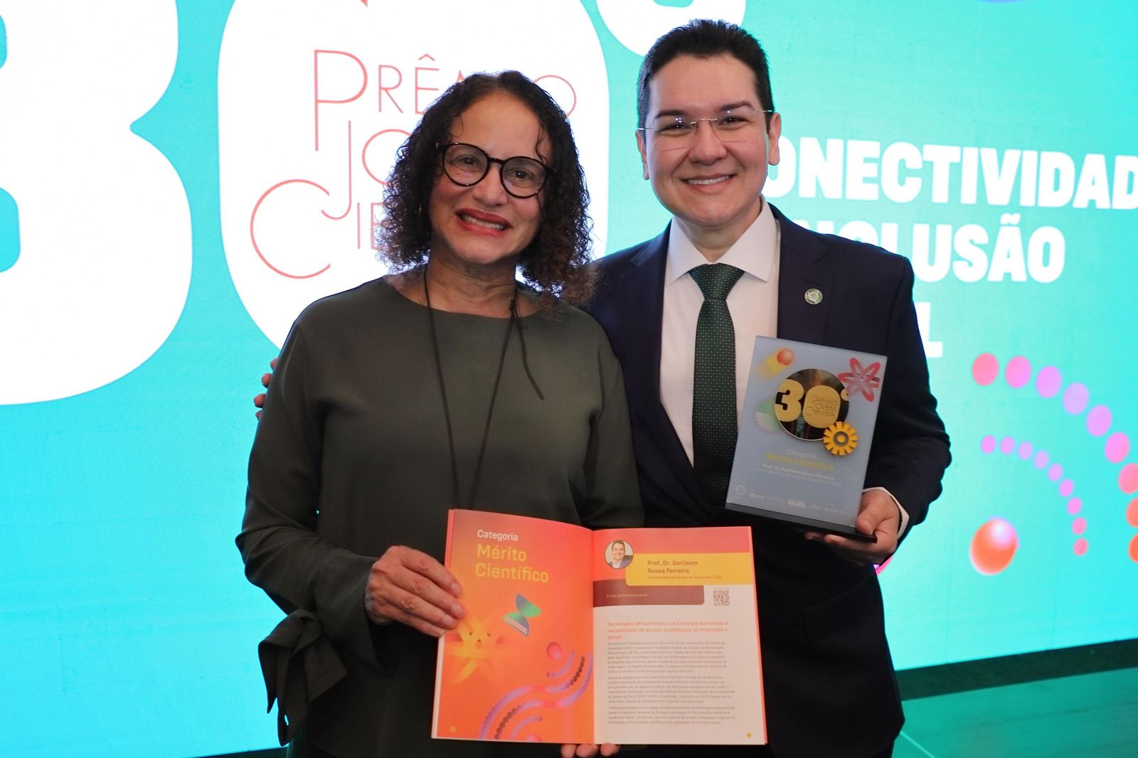 Os mais de 15 anos de dedicação à pesquisa, vasta contribuição acadêmica e alta qualificação conduziram o pró-reitor de Extensão e Assuntos Comunitários da Universidade do Estado do Amazonas (UEA), Prof. Dr. Darlisom Ferreira, ao reconhecimento no Prêmio Jovem Cientista. O docente foi agraciado com a categoria Mérito Científico na 30ª edição da premiação, que teve como tema “Conectividade e Inclusão Digital”. O evento foi realizado na quarta-feira (12/2), no Sesi Lab, em Brasília (DF), e contou com a presença da ministra da Ciência, Tecnologia e Inovação, Luciana Santos.