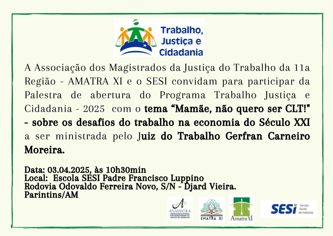 Com o tema “Mamãe, não quero ser CLT! – sobre os desafios do trabalho na economia do Século XXI”, a palestra será conduzida pelo juiz do Trabalho Gerfran Carneiro Moreira, e abordará as mudanças nas relações de trabalho, os impactos da informalidade, as novas dinâmicas profissionais e os direitos trabalhistas no contexto atual.