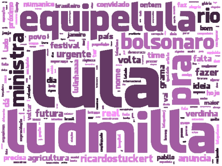 Já as publicações pró-Lula geraram interações em outros segmentos do Twitter. Do total de tuítes analisados pelo DataFórum, 26% foram repercutindo o ato de Lula na UERJ e feitos por figuras do campo progressista, além do próprio Lula. O preço dos combustíveis também esteve entre os assuntos de maior engajamento nesta bolha. Houve um grande volume, no entanto, de publicações positivas ao petista feitas por nomes ligados ao entretenimento (20%), devido ao encontro do ex-presidente com artistas. Destaque, neste segmento, para a publicação da cantora Ludmilla comentando a reunião com Lula e seu apoio ao ex-mandatário.