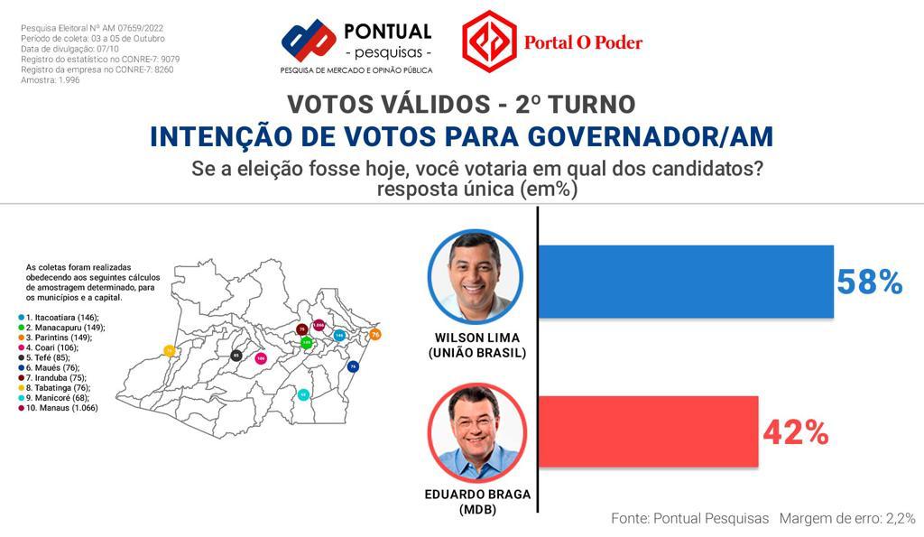 O candidato Wilson Lima (União Brasil) aparece com 58% da preferência de votos válidos dos eleitores amazonenses. Já Eduardo Braga (MDB) tem 42%. Veja o resultado da pesquisa.