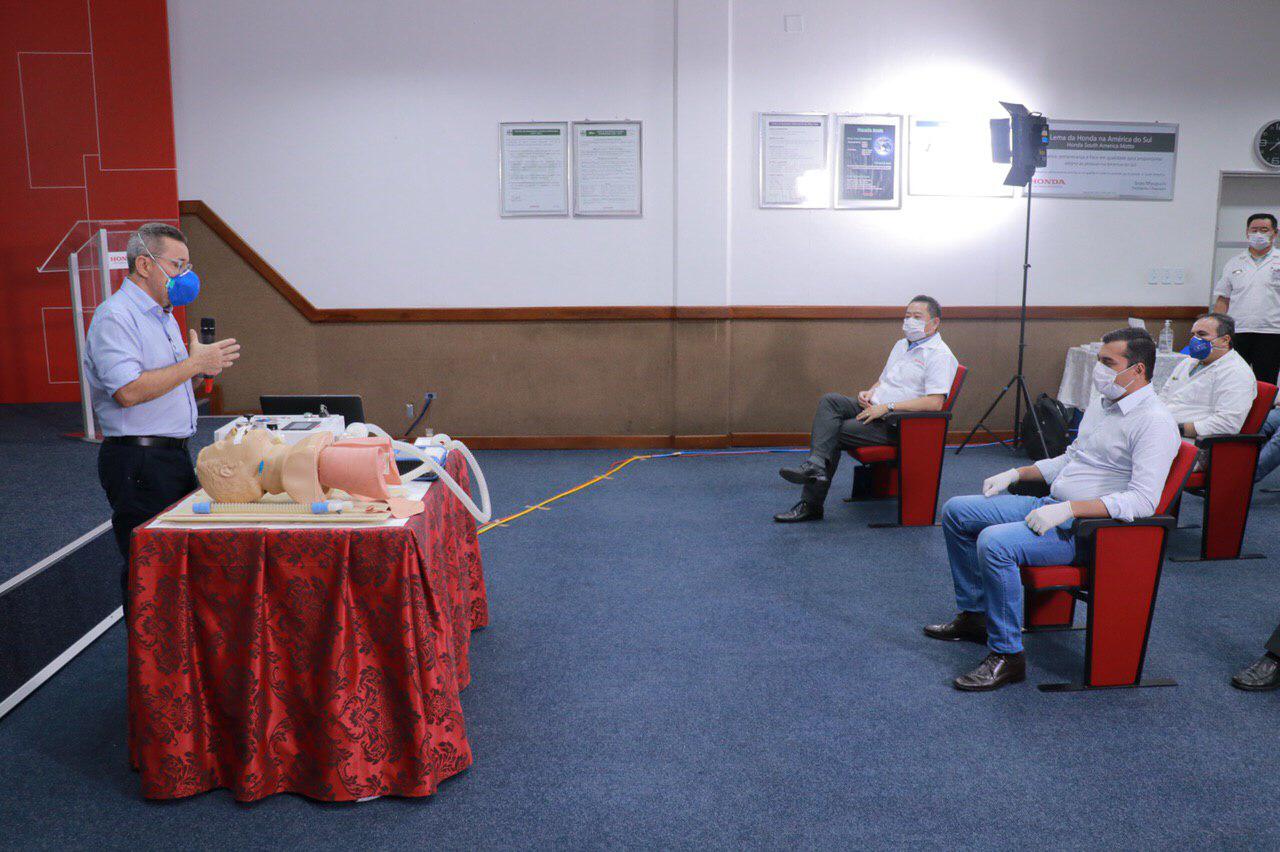 Parceria - A Moto Honda da Amazônia, maior fabricante de motocicletas do mundo, colocou à disposição do Governo do Amazonas uma equipe de profissionais e tecnologia para o desenvolvimento do respirador mecânico.O protótipo, apresentado na fábrica da Moto Honda, incorpora as principais funcionalidades para atender aos requisitos médicos como a dosagem apropriada da mistura de ar e oxigênio, o ajuste da pressão máxima e mínima, além do controle de frequência da respiração.