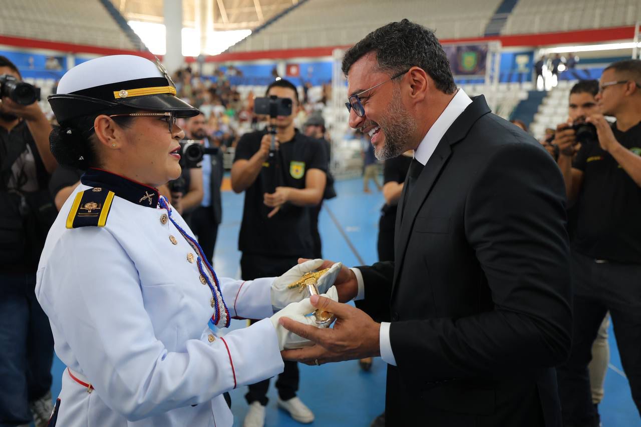 Na ocasião, o governador Wilson Lima realizou a entrega do Espadim Tiradentes para a cadete do 2º ano da Academia de Polícia Militar (APM) Coronel Neper Alencar, Jhoycynnara da Silva Fernandes, a primeira colocada no curso, que obteve as melhores notas e desempenho entre os 104 cadetes do CFO.