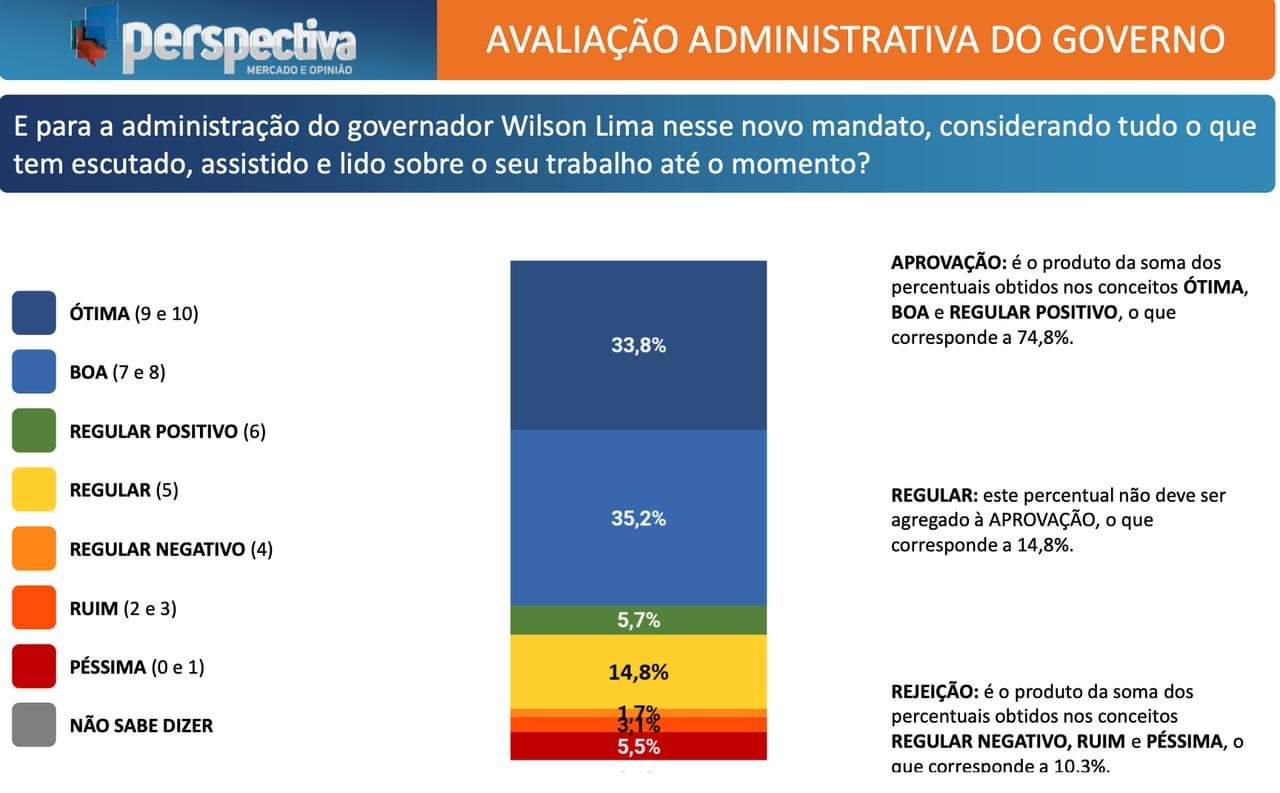 Para a administração do governador Wilson Lima nesse novo mandato, considerando tudo o que tem escutado, assistido e lido sobre o seu trabalho até o momento? Essa foi a pergunta feita. O governo Wilson Lima tem avaliação ÓTIMA, BOA e REGULAR POSITIVO, de 74,8%.